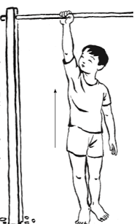 Tiến hành: Tay bên vai thấp bám vào xà ngang kéo người lên. Vai bên đối diện hạ thấp xuống. Giữ ở tư thế này vài giây. Làm 10 lần.
