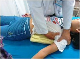 - Trẻ bám tay bên vai thấp vào mép giường. Ta nâng hai chân, hông trẻ đưa sang phía đối diện với bên lõm của cột sống thắt lưng. Làm 10 lần.